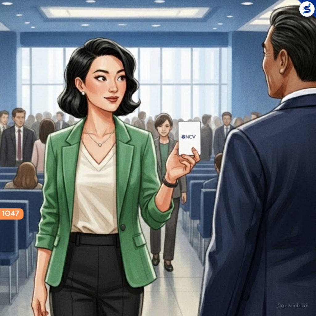 Những chiếc danh thiếp giấy cũ chất đống trên bàn. Chúng là biểu tượng cho sự lãng phí thời gian và thông tin tĩnh. Cô tự hỏi: Làm sao tôi có thể nói về sự đổi mới nếu phương thức giới thiệu của tôi lại lỗi thời? cô tự hỏi. Đó là lý do cô đã chuyển sang sử dụng Danh Thiếp Thông Minh tích hợp với Hệ thống NCV.