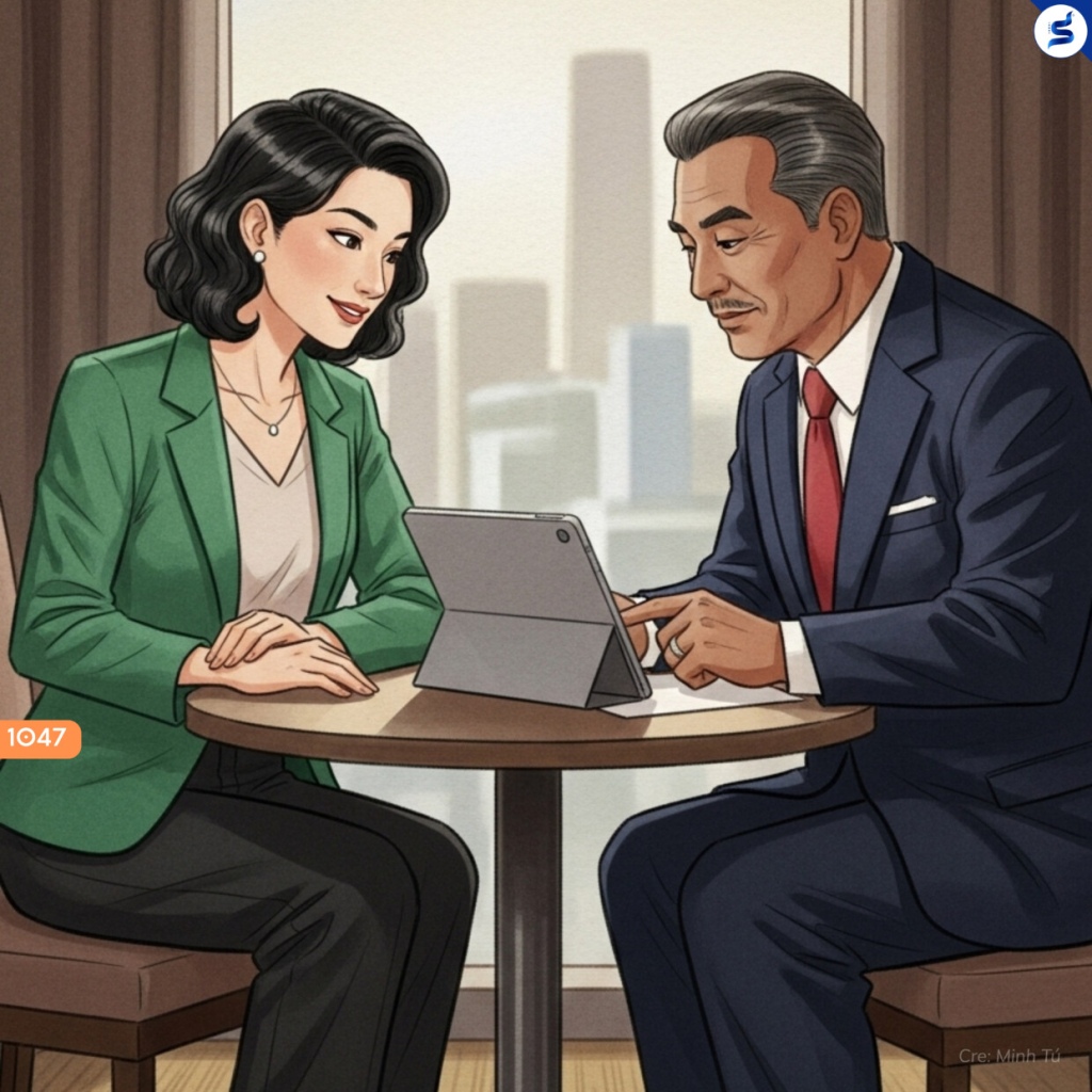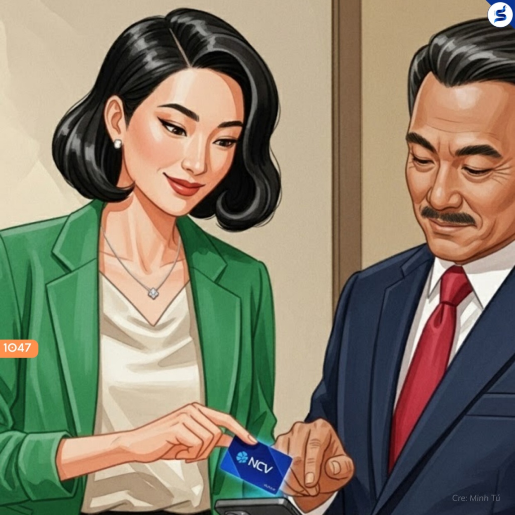 Mai Chi không nói lời nào về tài liệu. Cô chỉ nhẹ nhàng tiến lên, mỉm cười và nói: Thưa ông Thành, để tối ưu hóa thời gian của ông, tôi xin được trao đổi giải pháp thay vì thông tin cơ bản. Cô từ từ rút ra và đưa chiếc Danh Thiếp Thông Minh của mình cho ông quét mã QR trên chiếc thẻ.