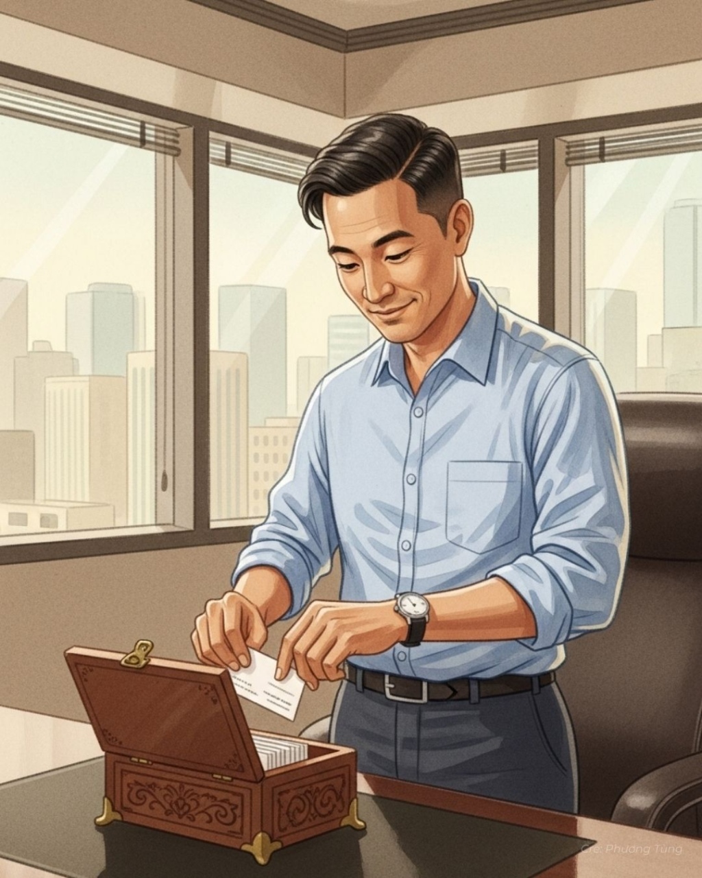 Bà Thảo ngước lên, ánh mắt đã thay đổi. Bà không chỉ thấy một đối tác tiềm năng, mà còn nhìn thấy một con người với đam mê và câu chuyện đáng tin cậy. Bà mỉm cười nói: Đây không chỉ là một danh thiếp, mà là một cây cầu kết nối.