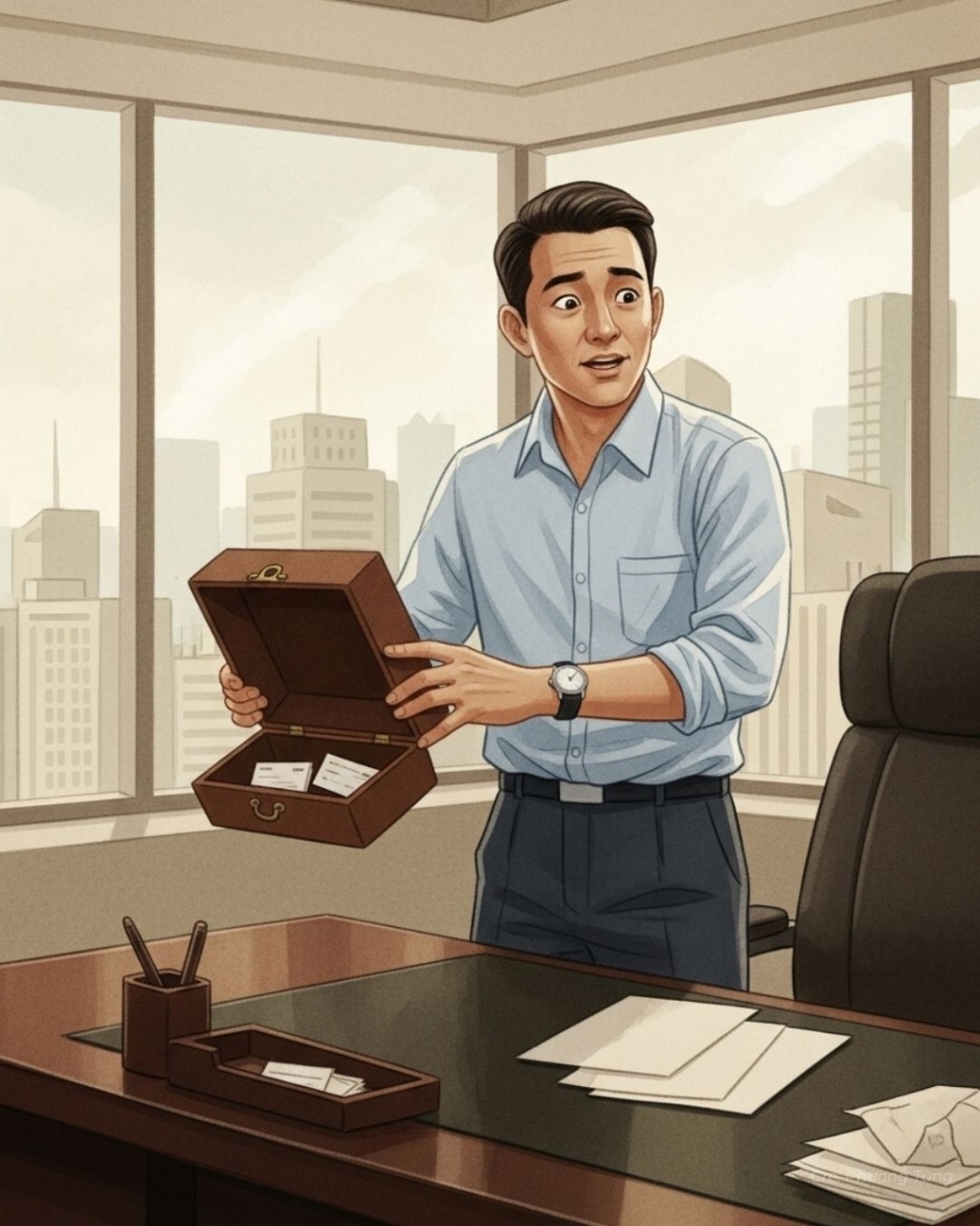 Một ngày, trước cuộc hẹn quan trọng với bà Thảo – một đối tác tiềm năng, anh Huy bỗng hoảng hốt khi phát hiện chiếc hộp gỗ trống rỗng. Toàn bộ danh thiếp giấy anh trân trọng giữ gìn đã biến mất.