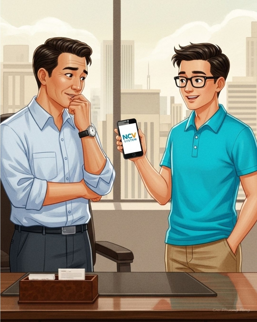 Trong giây phút bối rối ấy, Khoa – một đồng nghiệp trẻ – bước vào. Thấy anh Huy lúng túng, Khoa mỉm cười: Anh Huy, sao anh không thử dùng danh thiếp điện tử NCV? Nó sẽ giúp anh nhiều đấy. Anh Huy do dự, nhưng không còn lựa chọn nào khác. Anh nhanh chóng tạo một hồ sơ trên hệ thống NCV. Chính quyết định ấy đã mở ra cho anh một hành trình mới – nơi mà công nghệ không chỉ đơn thuần là công cụ, mà còn là câu chuyện kết nối con người.